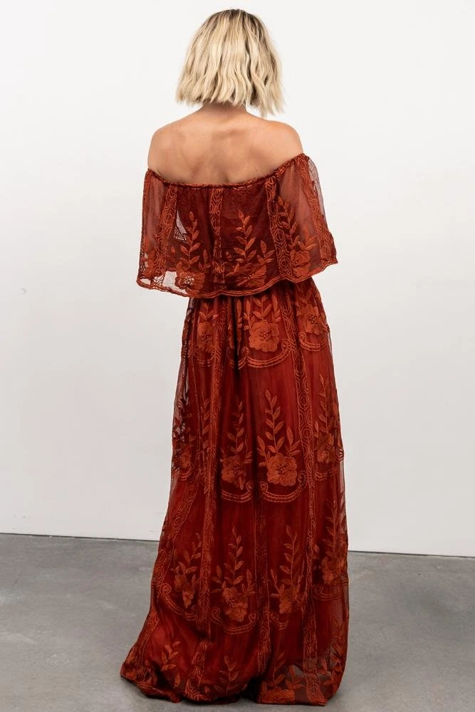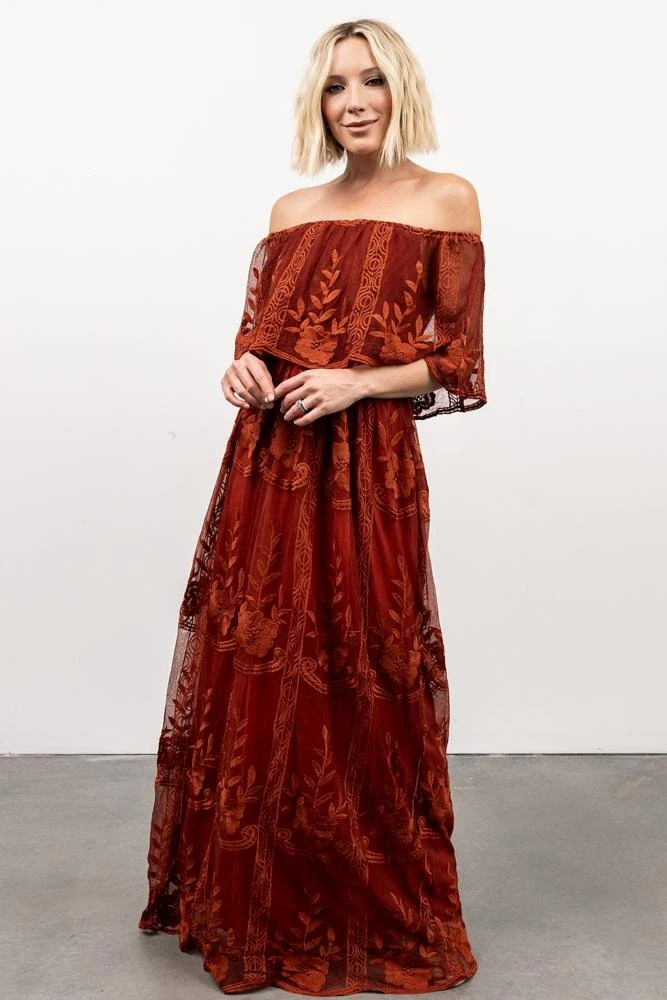 BB Custom Leon Off Shoulder Maxi Dress | Rust Dresses