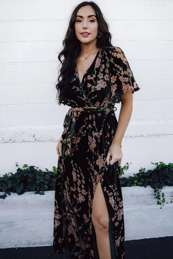 BB Custom Uma Velvet Maxi Dress | Green Floral