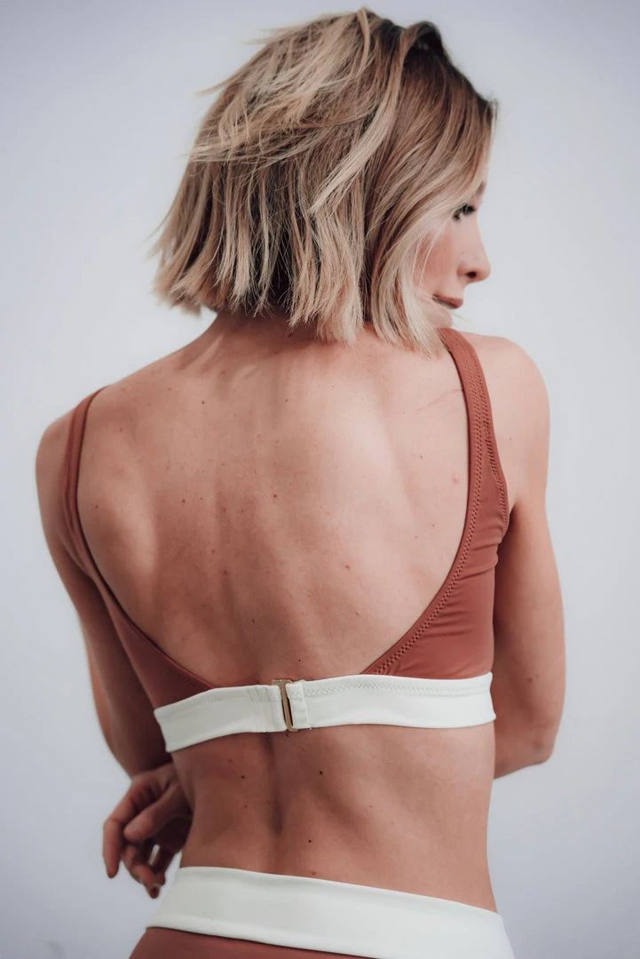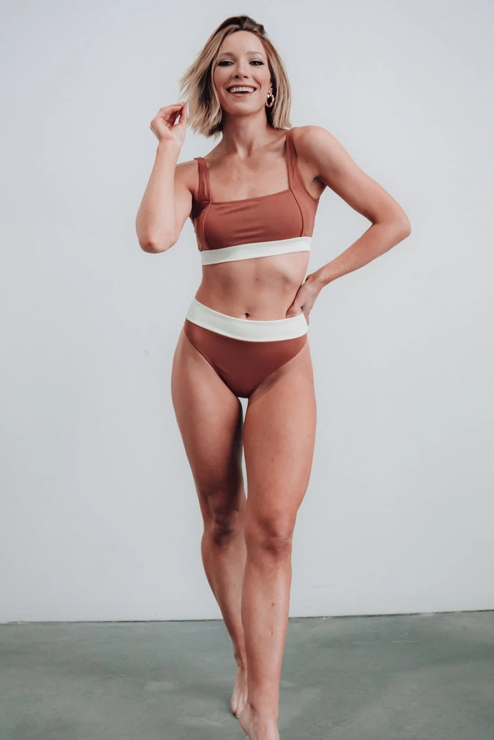FINAL SALE. Trend alert! Say hello to one of our favorite bikini styles in a brand new color! With the flattering square neckline and white contrast band, all you need are the bottoms to match!Â