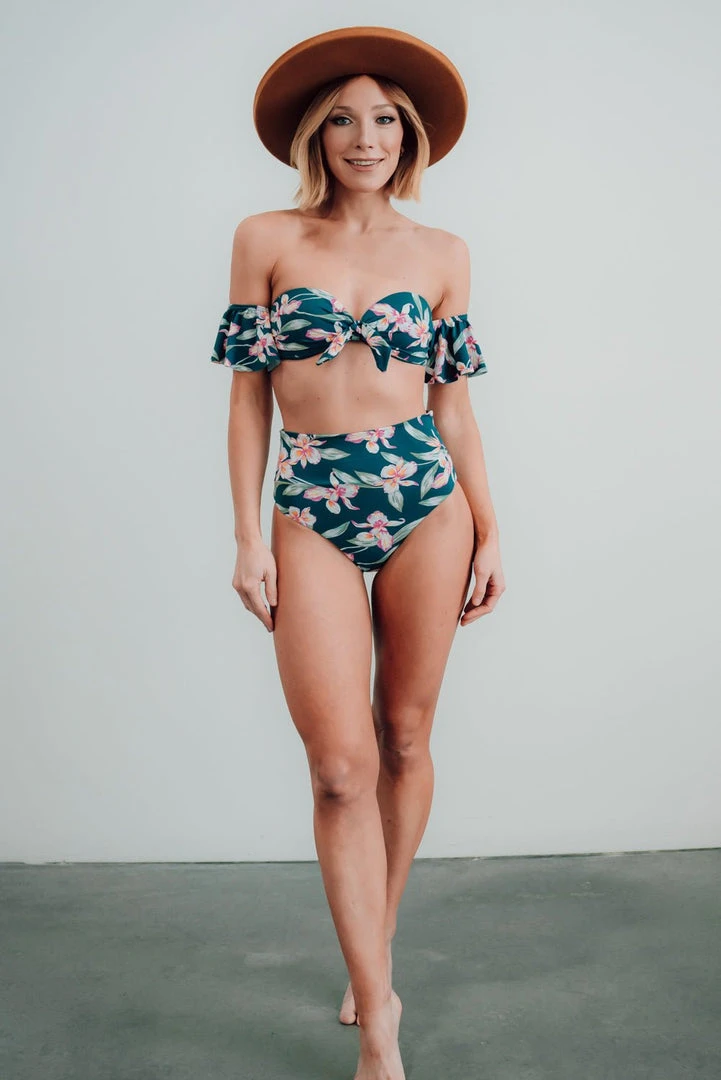 FINAL SALE. Dainty topaz floral high waisted bottoms, with the ability to be folded down to created a banded mid rise bottoms.. Do you know where this would be perfect to wear, Miami!Â