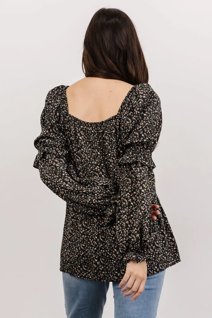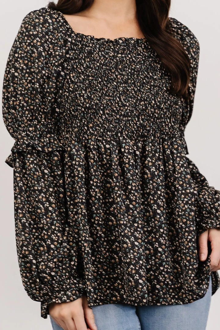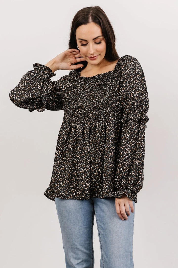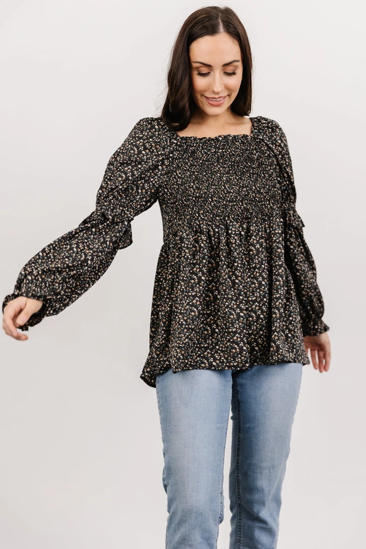 HAY Asha Smocked Boho Top | Black Floral Tops