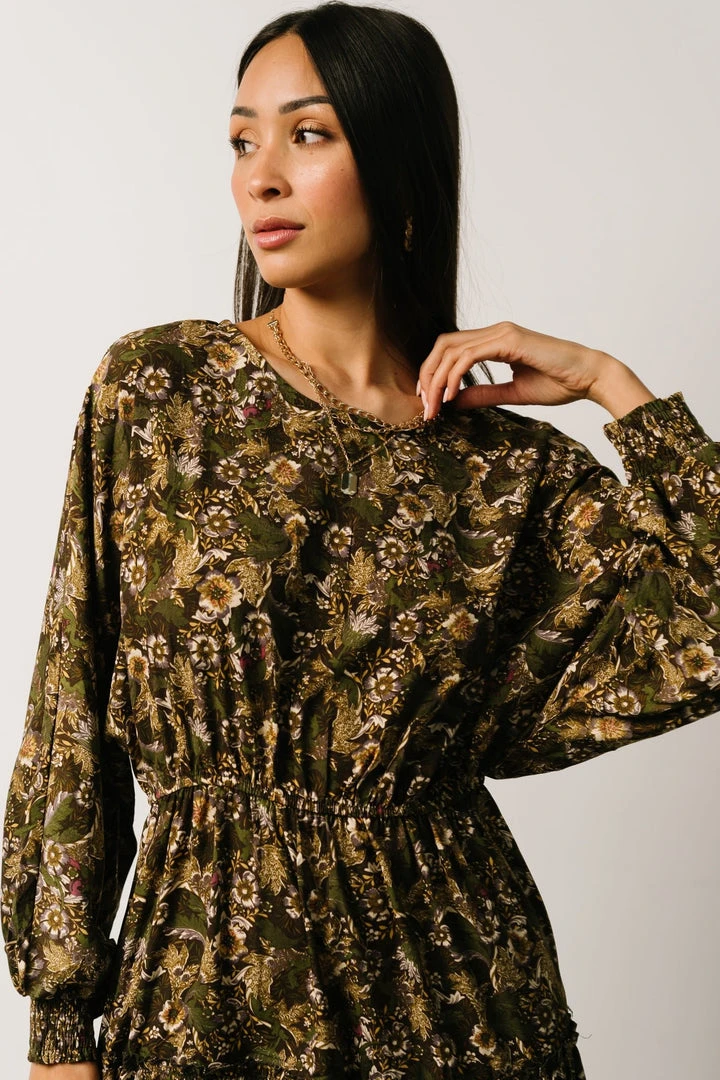- Olive, bronze, cream, slate, and fuchsia floral print