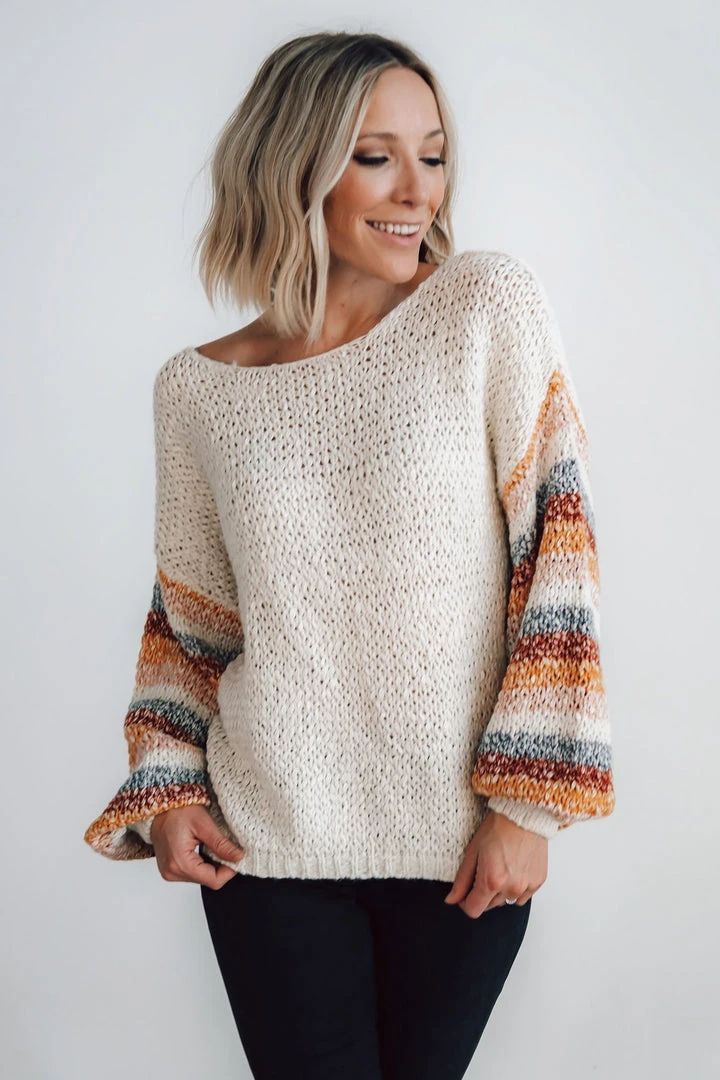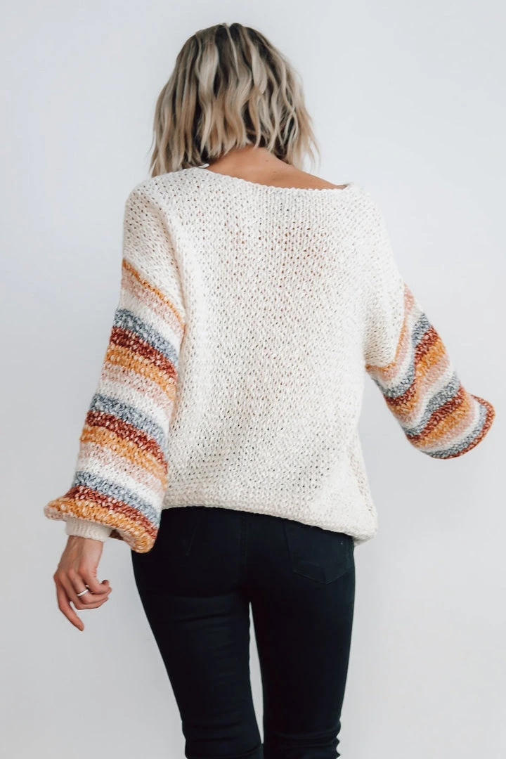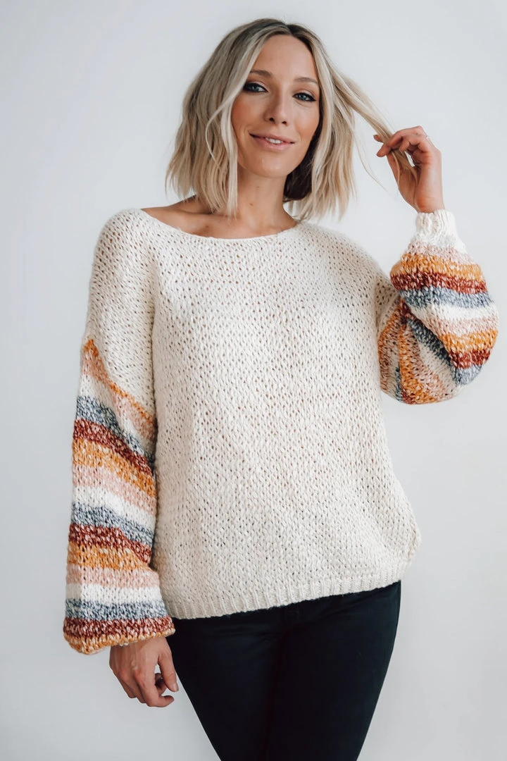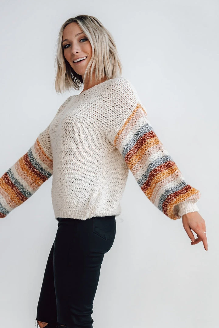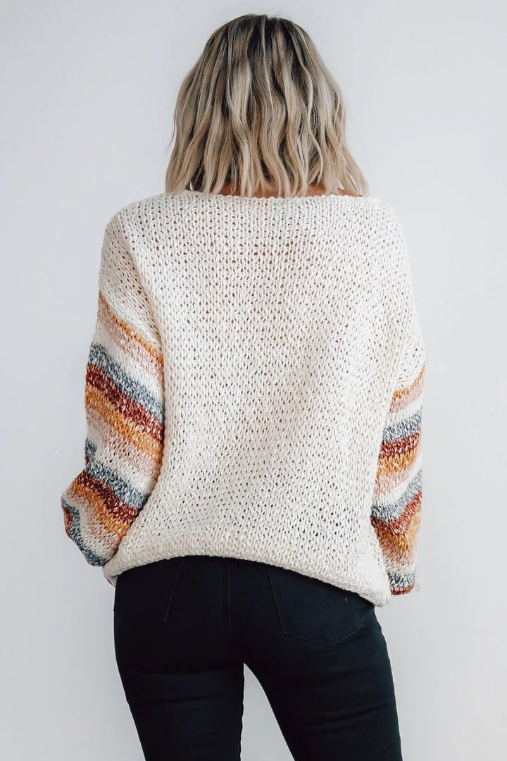 - Chunky knit oatmeal material with multi color stripes down sleeves