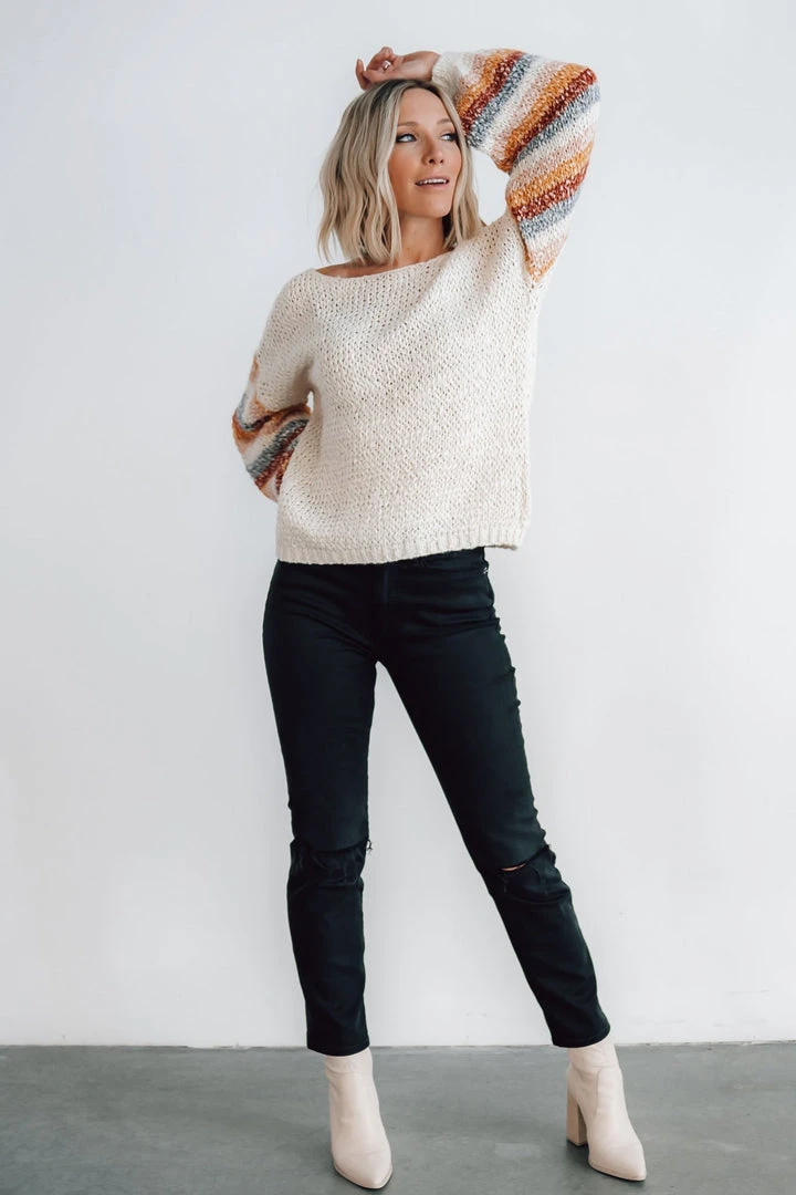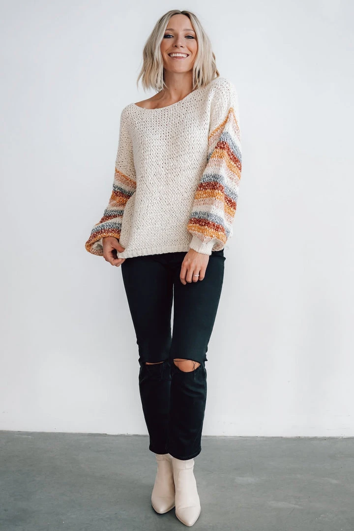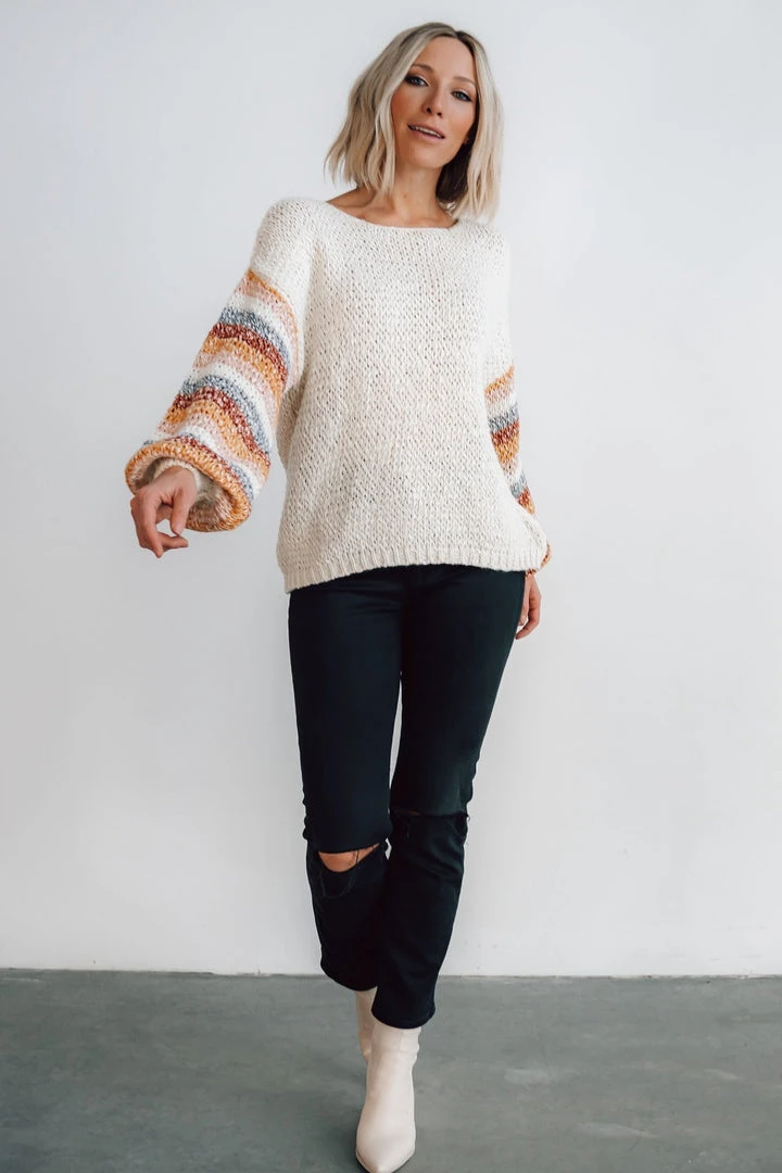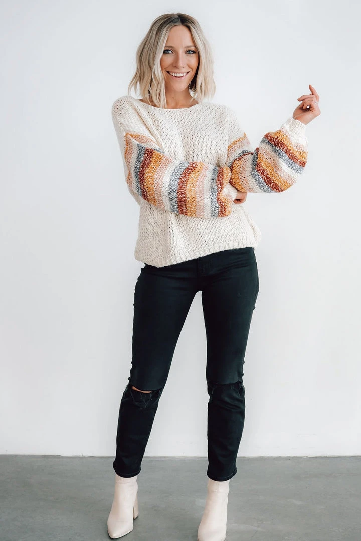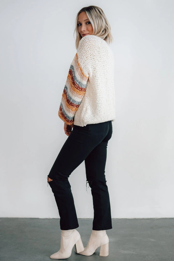 - Chunky knit oatmeal material with multi color stripes down sleeves