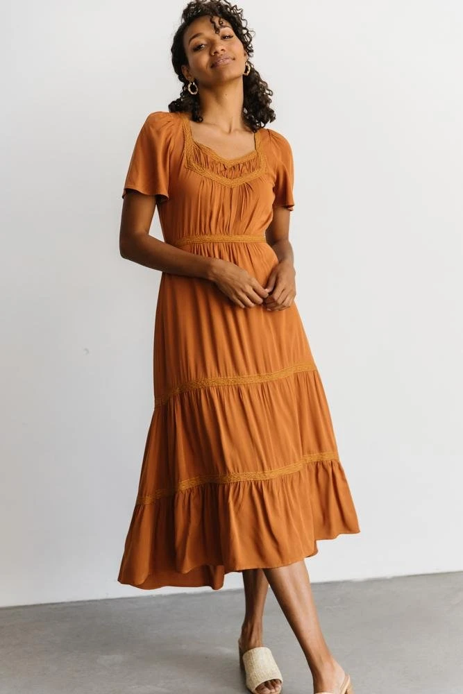 - Lace trim at upper bodice, waist, and skirt tiersÂ