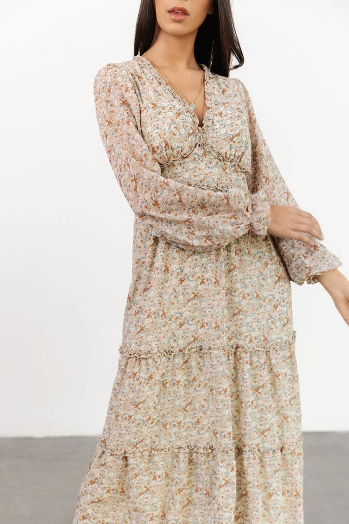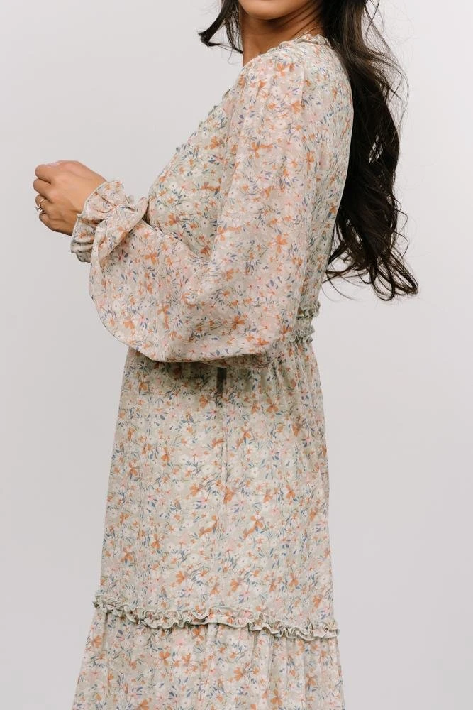 - Gorgeous flowing sage chiffon material with blue, ivory, and blush colored floral design throughout